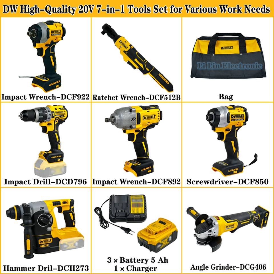 Serie Amarilla, Herramientas Eléctricas Populares para Exteriores 7 en 1 con Cargador y Batería de 5ah, Kit de Herramientas de 20V, Herramientas Eléctricas Duraderas sin Escobillas