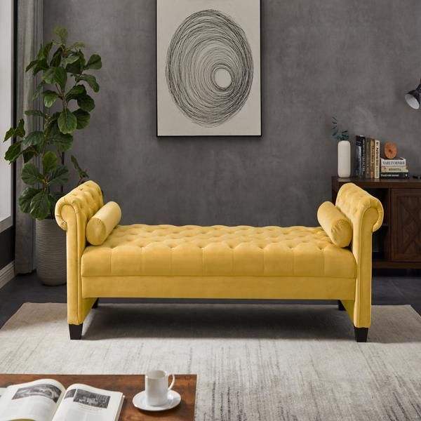 Banco de Sofá Rectangular de Terciopelo con Patas de Madera Maciza Amarillas y Cojines Cilíndricos Integrados para Sala de Estar
