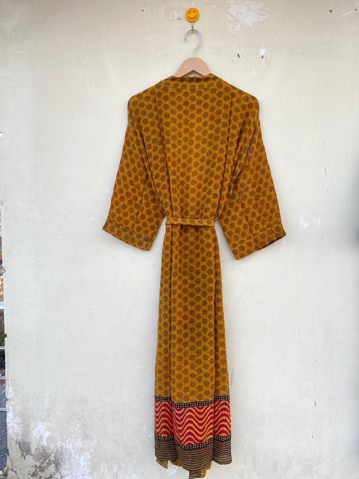 Batas Kimono de seda pura amarilla, ropa de salón Bohemia con estampado largo a la moda, Sari de seda reciclada para verano, otoño y primavera