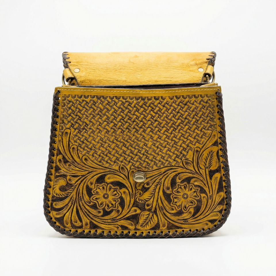 Bolso de Hombro de Cuero Genuino 100% para Mujer, Ligero, Amarillo y Negro, con Bordado Floral Tallado a Mano