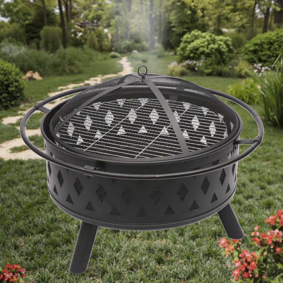 Pozo de fuego de acero redondo Yoho de 30 pulgadas con tapa de malla Parrilla de barbacoa Rejilla para patio o patio trasero Jardín Pozos de fuego de leña