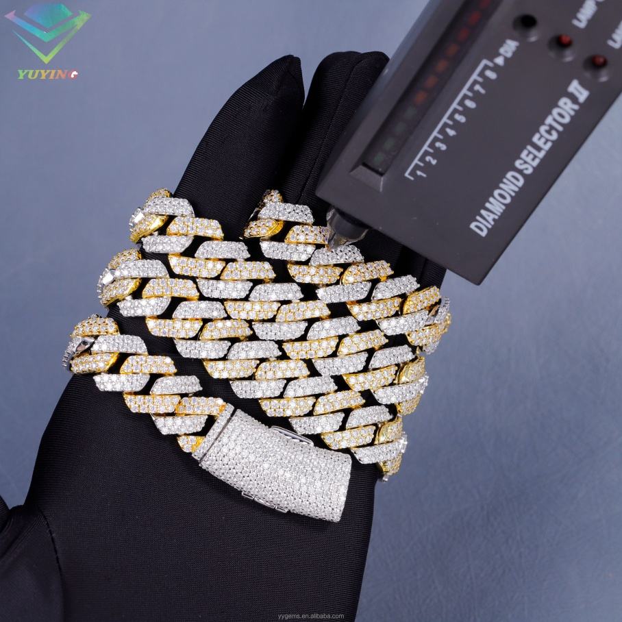Cadena Cubana Yu Ying de 14 mm de Ancho, 2 Filas, Chapada en Oro Blanco/Amarillo, con Diamantes de Moissanita, para Hombre, Joyería de Plata
