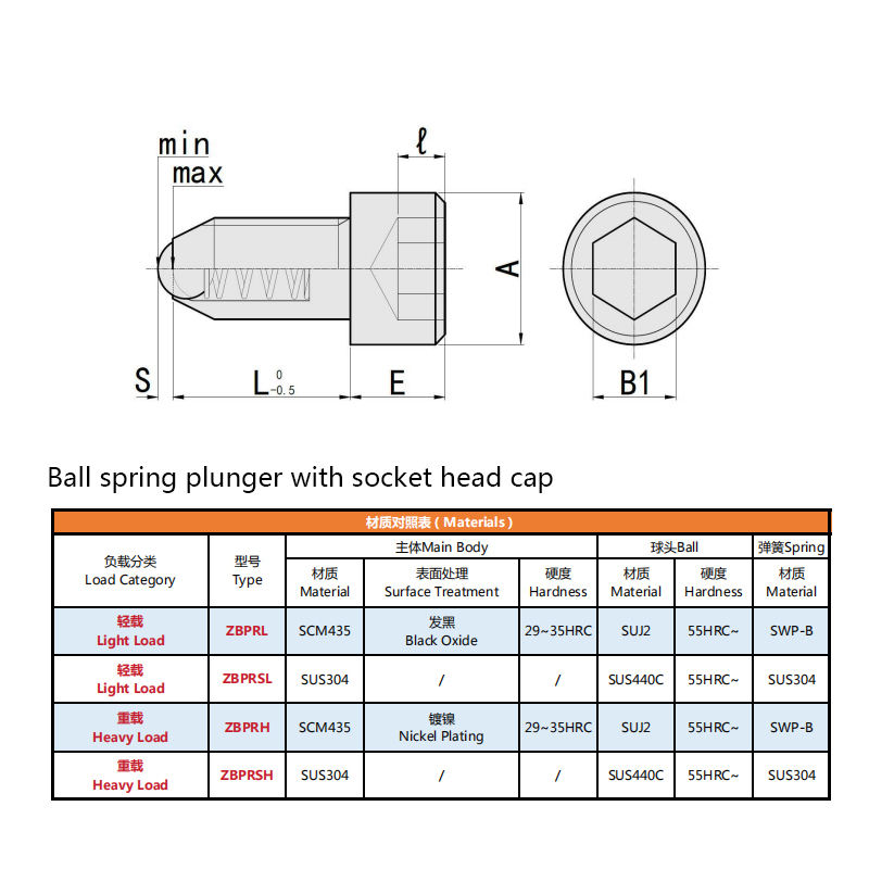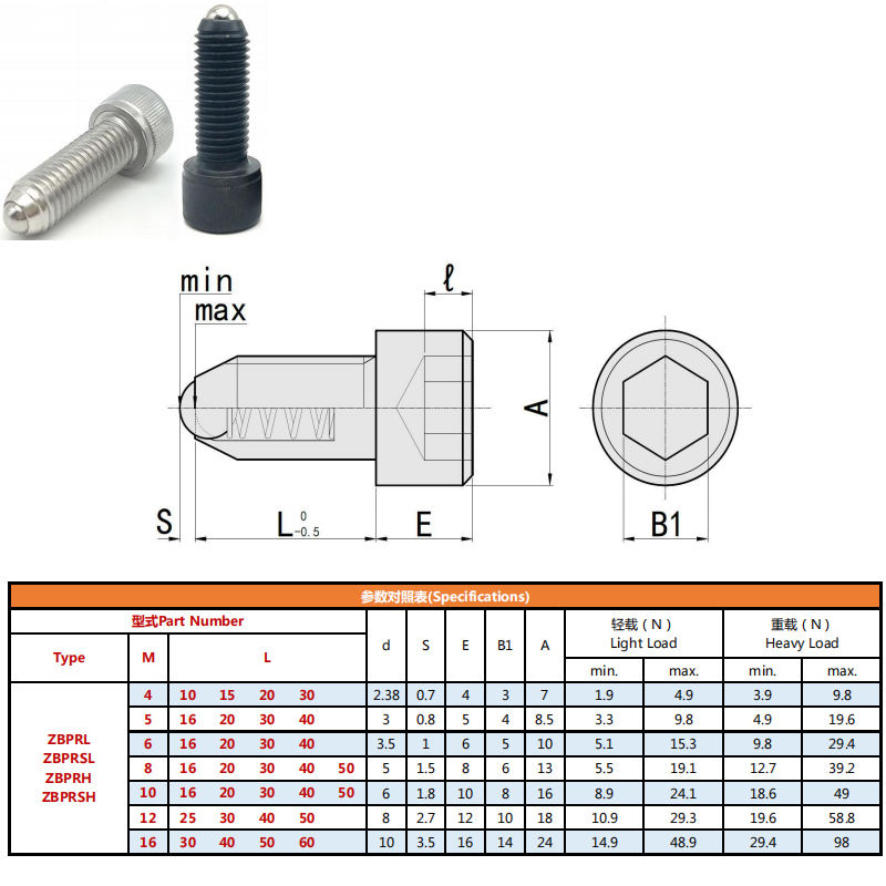 ZBPRL Pasadores de émbolo de carga pesada de resorte de punta esférica de alta calidad con tapa de cabeza hueca Allen M4/5/6/8/10/12/16 Rosca