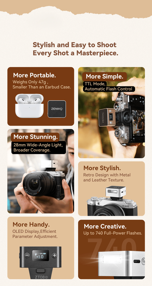 Flash para Cámara Recargable Mini ZENIKO ZT08 con Pantalla HSS y Medición Automática TTL