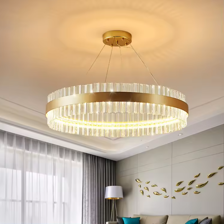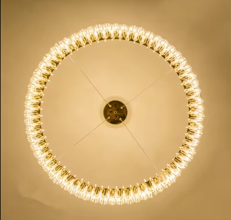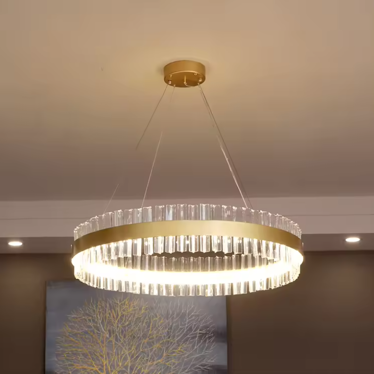 Soluciones de iluminación de servicio:Iluminación y circuitos de diseño, Proyecto de instalación, Lámpara de araña LED de cristal transparente con luces retro en forma de anillo