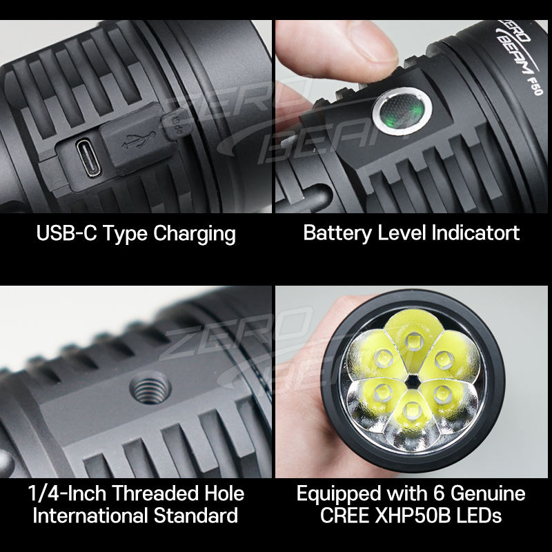 Linterna LED Profesional Recargable ZeroBeam F50, 17000 Lúmenes, Impermeable IPX8, Alcance de 560m, 6 LED, Resistente para Exteriores
