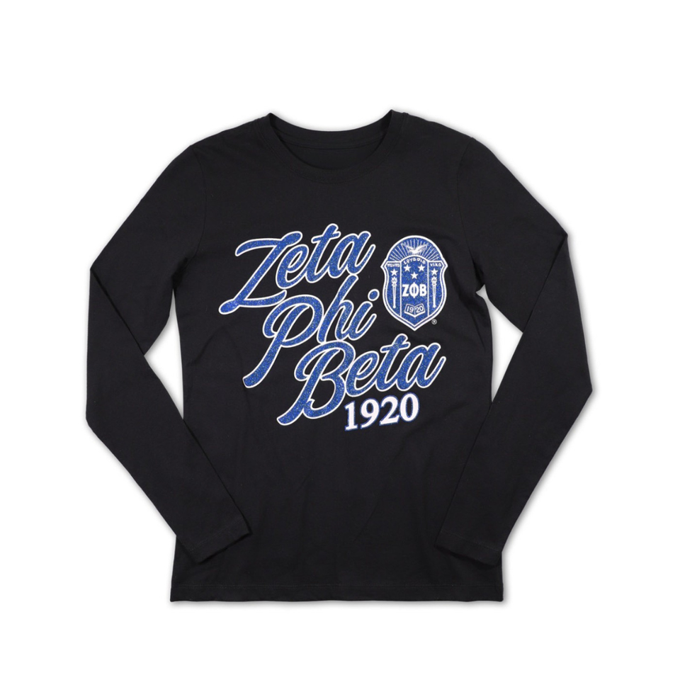 Zeta Phi Beta 1920 Script Logo Camiseta Bordado de manga larga de algodón negro Ropa de vida griega Ropa de hermandad personalizada