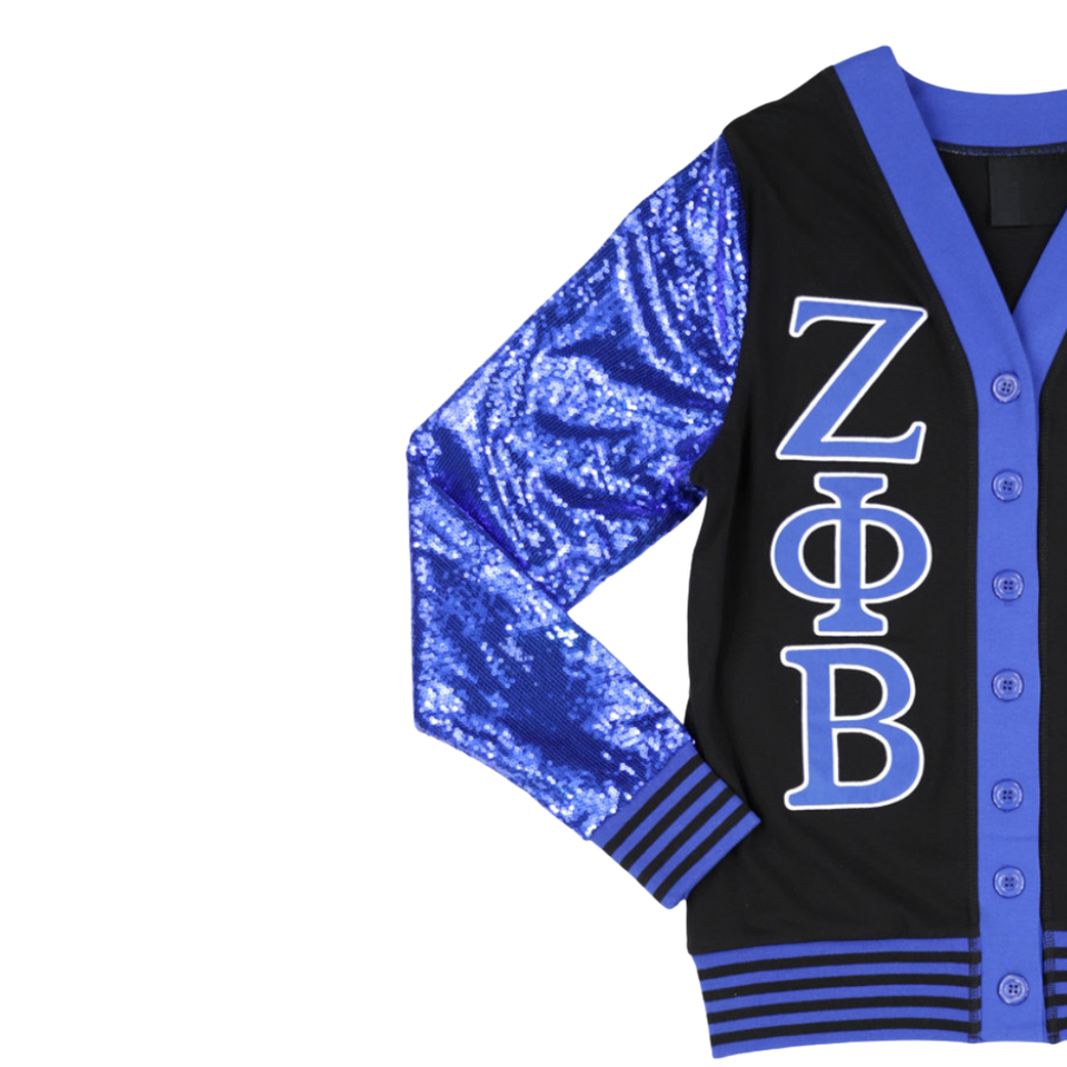 Cárdigan de lentejuelas negras Zeta Phi Beta con mangas azules logotipo bordado Est 1920 Premium Sorority Apparel Custom Greekwear