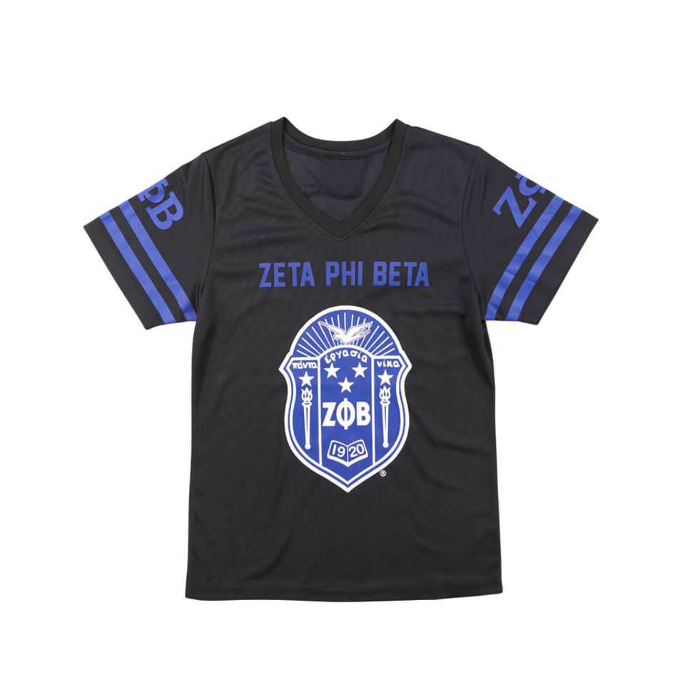 Camiseta de fútbol Zeta Phi Beta, camiseta negra 100% de poliéster con logotipos bordados, talla real, cuello en V, dobladillo de mangas a rayas dobles