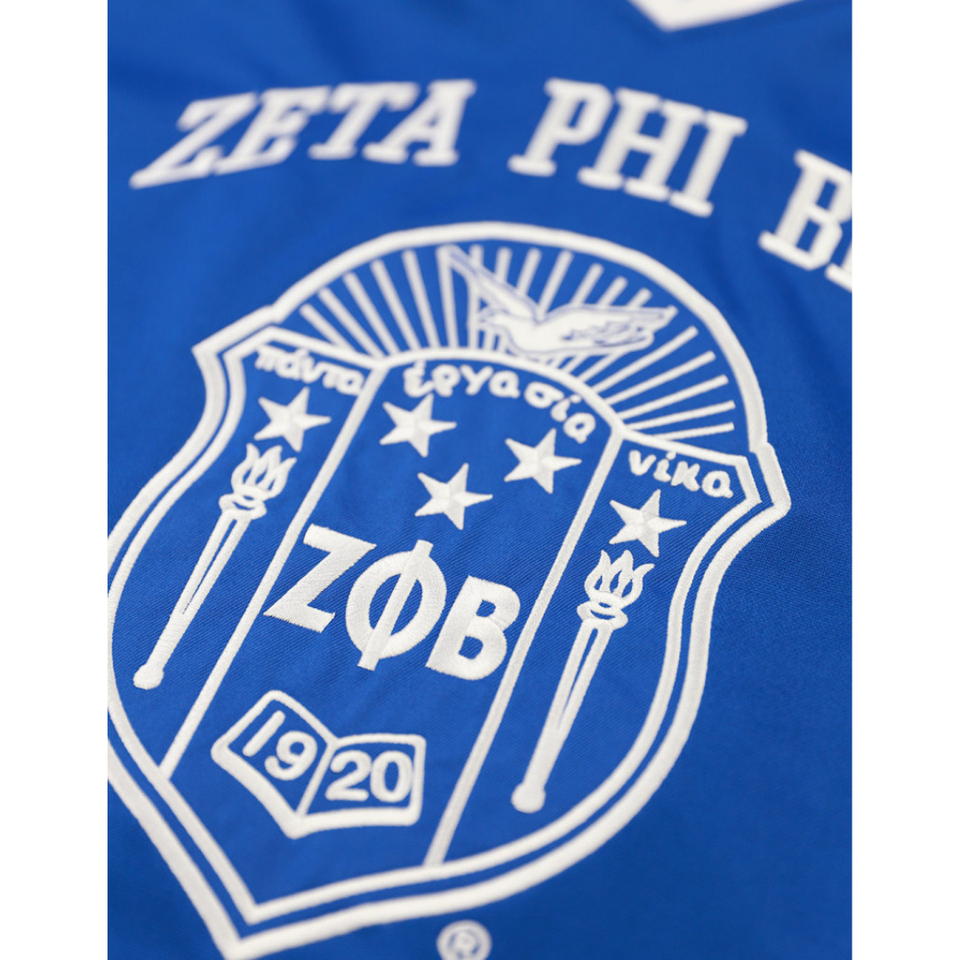 Camiseta de fútbol azul real Zeta Phi Beta, 100% poliéster, Escudo de equipo bordado, talla real, cuello en V, dobladillo de doble rayas
