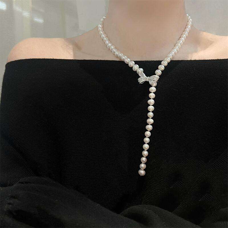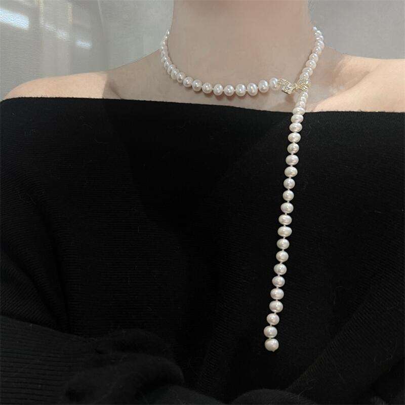 Collar de Perlas de Agua Dulce Naturales Zhizhen de 7-8 mm, Cadena de Suéter, Plata de Ley S925, Colgante Fino con Lazo de Precisión