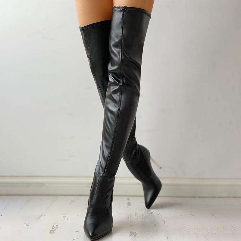 Botas Largas Estilo Western con Cremallera Trasera, de Cuero Negro, con Tacón de Tubo, Tallas Grandes, por Encima de la Rodilla