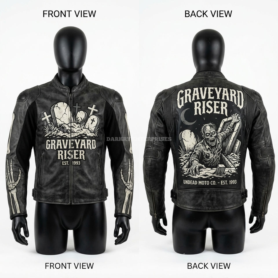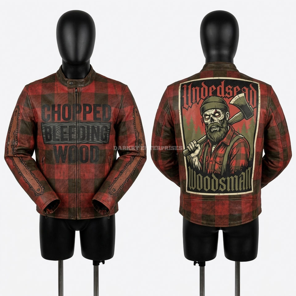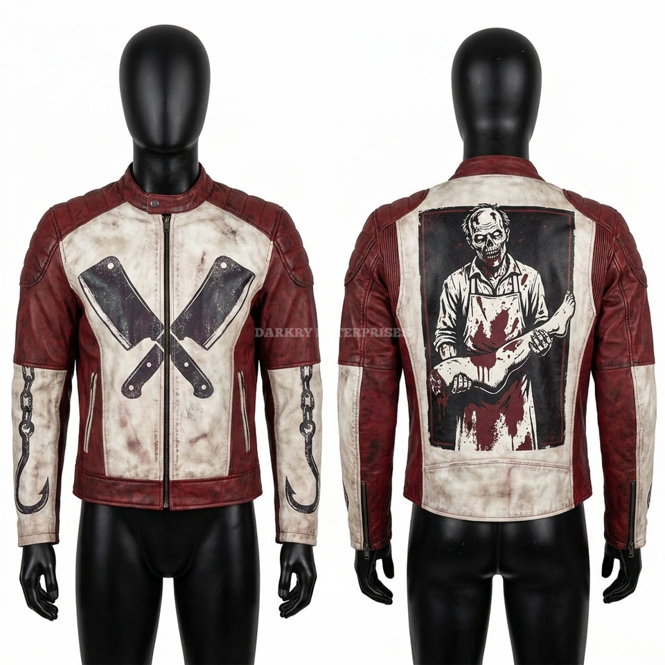 Chaqueta de cuero Zombie Butcher para hombre, personalizada, blanca con salpicaduras de sangre roja, estilo motero, con gráfico de cuchillo de carnicero, para motocicleta y ropa urbana.