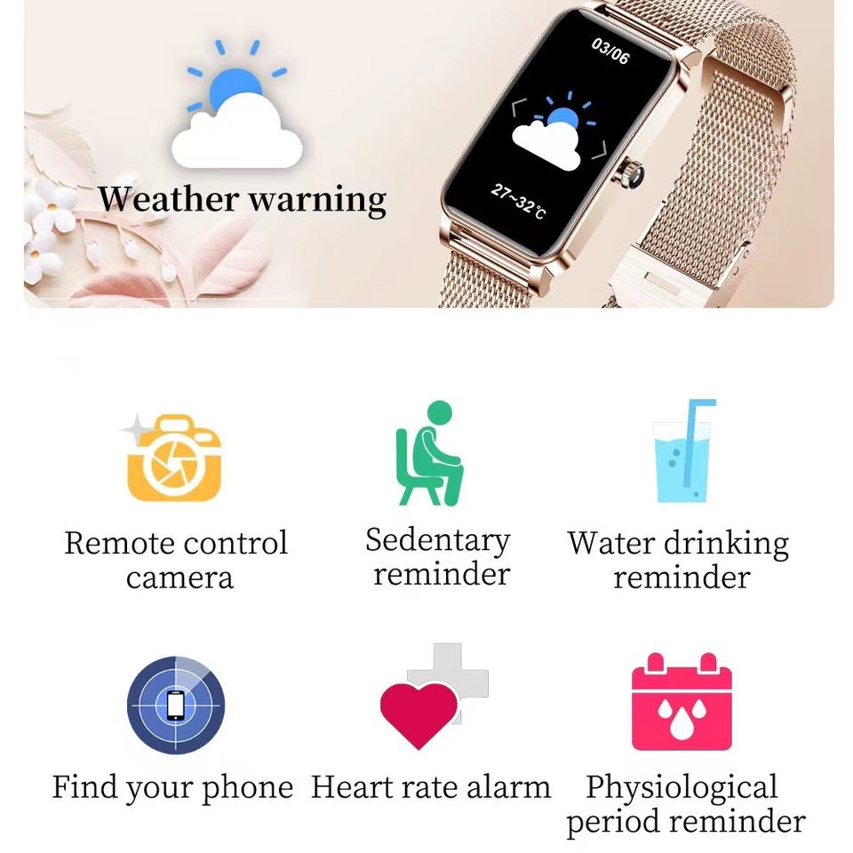 Cronógrafo, Calendario, Reloj despertador, Reserva de marcha, Control remoto, Rastreador de sueño, Medición de velocidad, Podómetro, Respuesta telefónica, Mensaje emergente, Recordatorio de mensajes, Marcar llamada, Seguimiento de la actividad, Llamada de voz, Correo electrónico, Reproductor DE MÚSICA, Recordatorio sedentario, Botón SOS, Gestión menstrual, Asistente de voz AIFunción