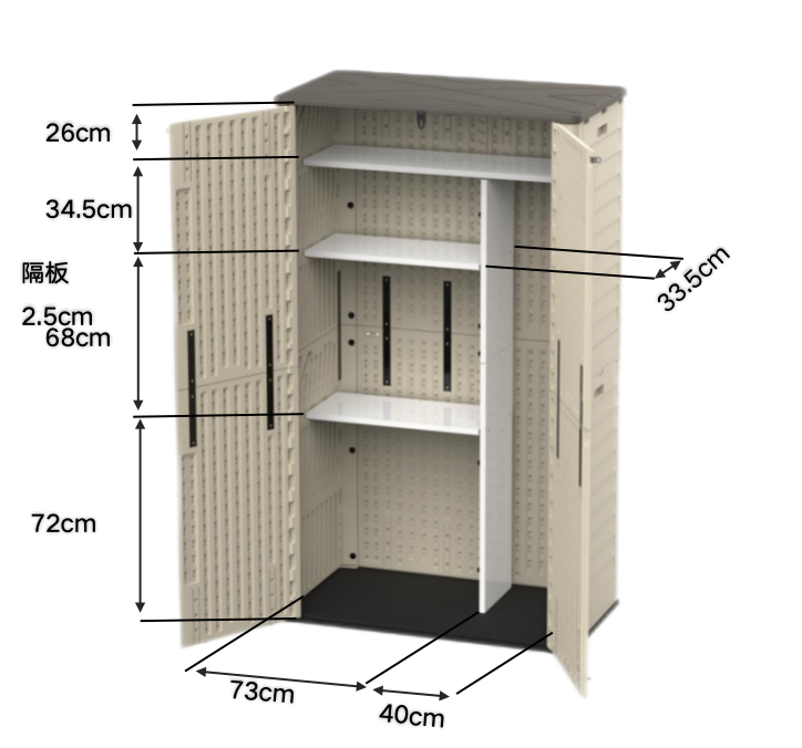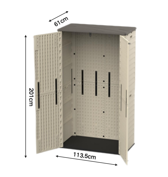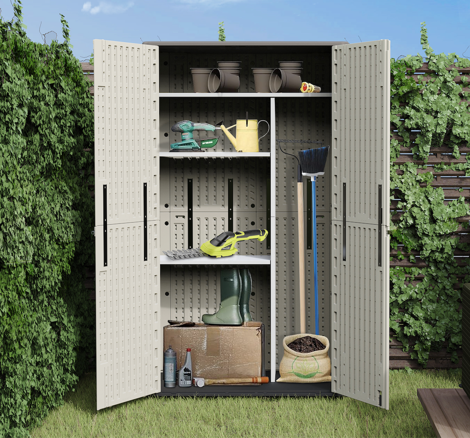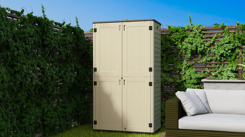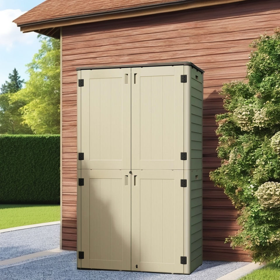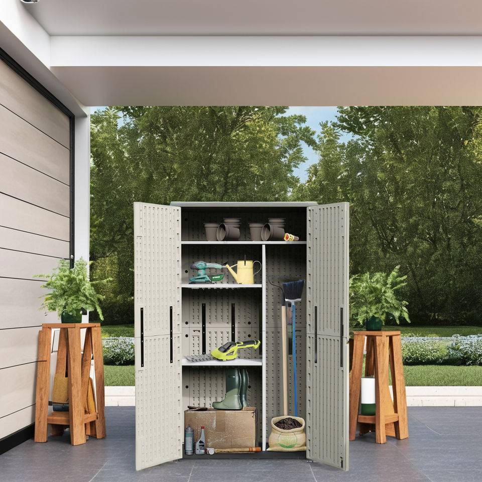 BenJia Precio bajo HDPE Plástico Unidad de gabinete de almacenamiento al aire libre 24,5 Cu.Ft para patio trasero Cobertizo de jardín resistente a la intemperie