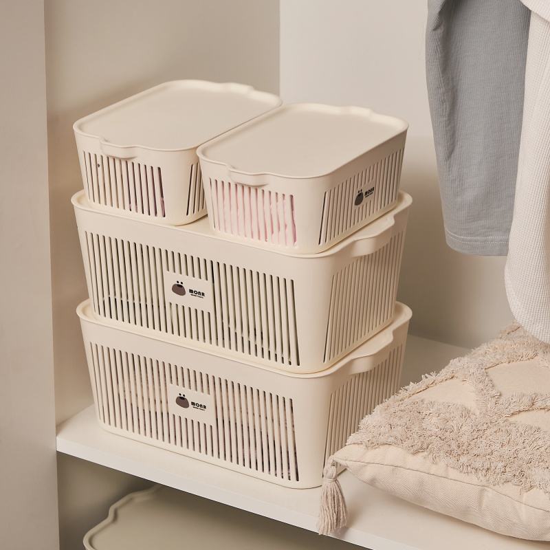 MONR cesta apilable de plástico con tapa - organizador para ropa y ropa interior, diseño a rayas con huecos, caja plástica multifuncional