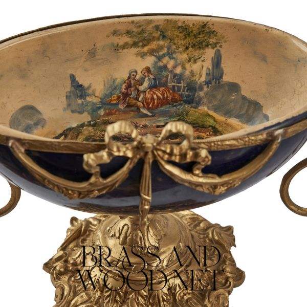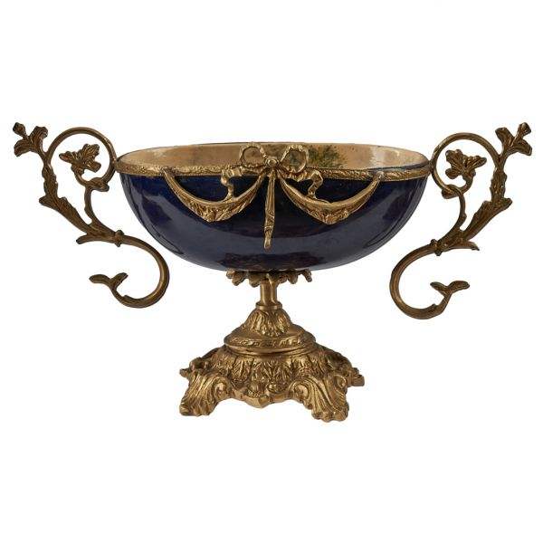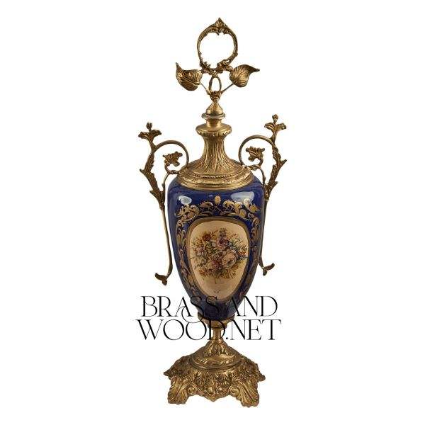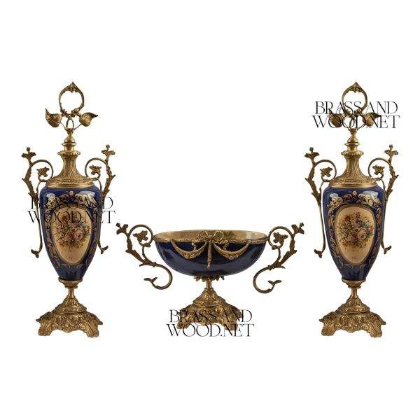 Porcelana azul antigua y centro de mesa de latón con jarrones adornados hechos a mano decoración vintage de lujo accesorio elegante