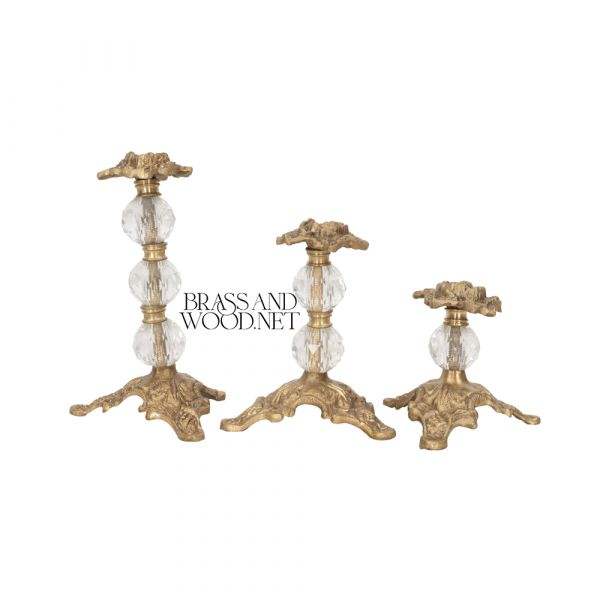 Juego de candelabros de latón antiguo y cristal, diseño adornado clásico europeo, detalles decorativos de lujo para interiores elegantes