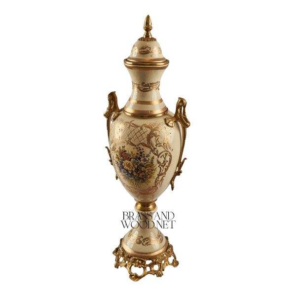 Jarrón alto decorativo de latón antiguo y porcelana con arte floral pintado a mano, base dorada ornamentada y diseño clásico vintage.