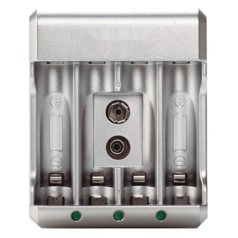 Cargador de pilas recargables AA/AAA/9V con varias características técnicas, ideal para mantener encendidos los dispositivos electrónicos.