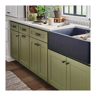 Gabinetes de cocina modernos de 5 piezas, acabado de pintura de laurel, madera maciza con panel de cerámica