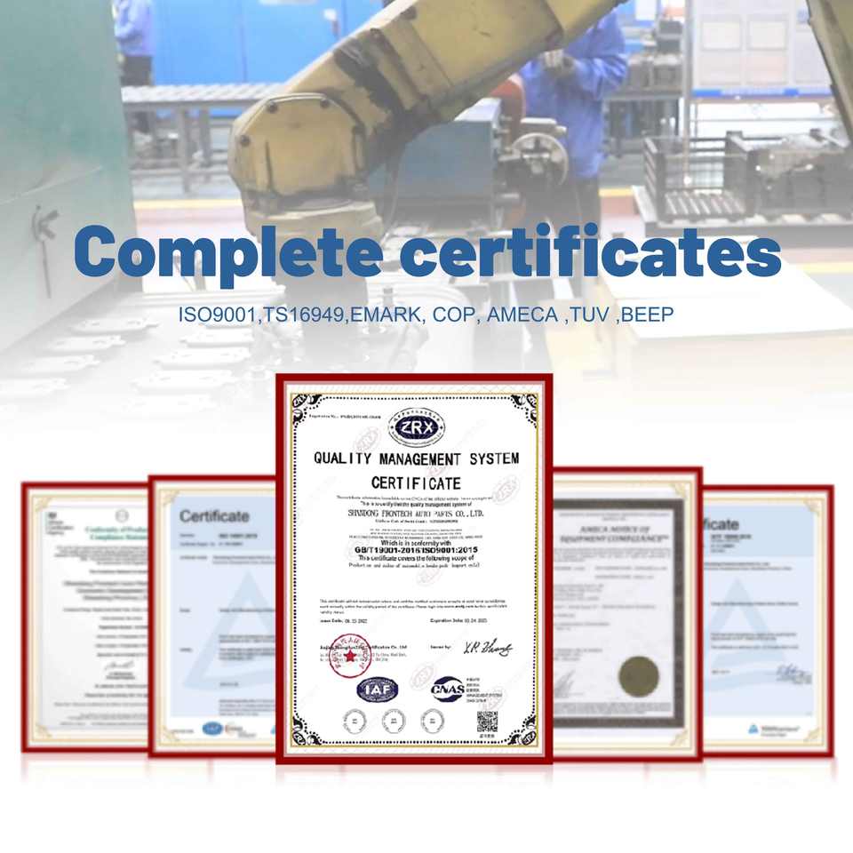 TS16949, ISO14001, ISO9001, E-mark(R90), AMECA, TUV, COP, etc.