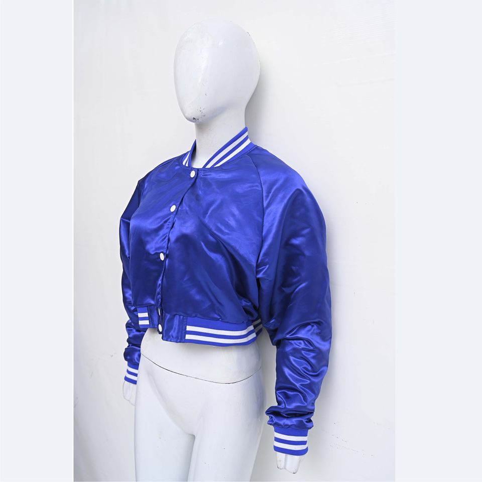 Chaqueta bomber corta de satén azul brillante, chaqueta corta azul real para mujer, chaqueta de satén con cuello a rayas y botones a presión, elegante e informal