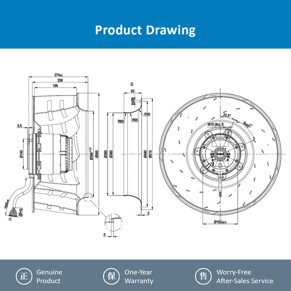 Ventilador centrífugo industrial de gran tamaño, trifásico, con aspas curvadas hacia atrás, ebm-papst R4D560-AQ03-01, 400V, 560mm, para HVAC.