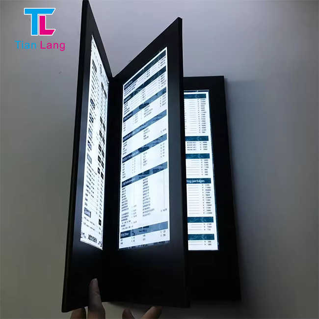 Barra de 3 páginas personalizada de fábrica, menú de cuero brillante LED de 8,5 "x 11", soporte de menú de cuero PU electrónico luminoso para restaurante para club nocturno