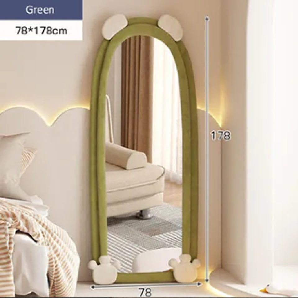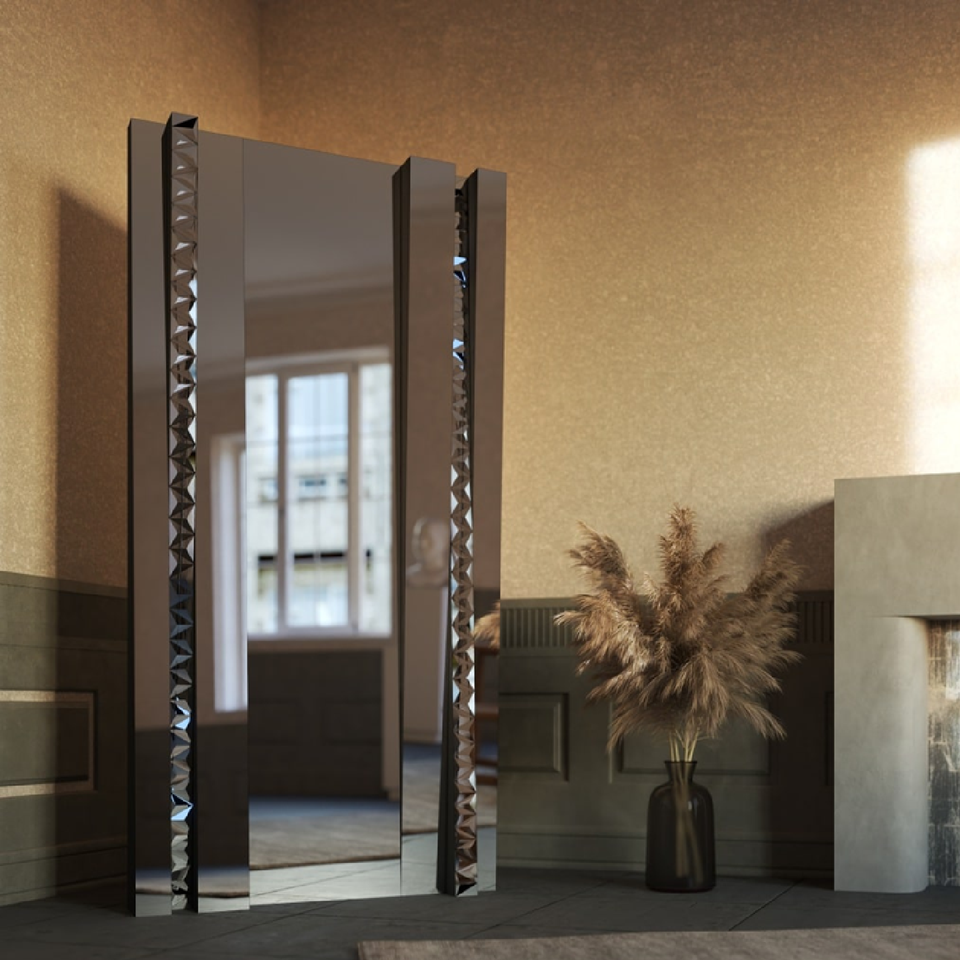 El espejo de cuerpo entero presenta un diseño de varios paneles con llamativos detalles geométricos espejados a lo largo de sus bordes