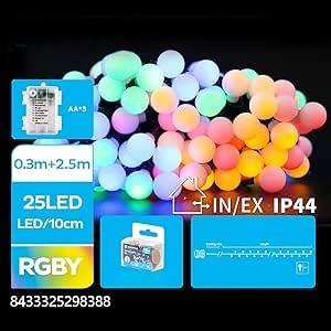 Guirnalda de luces LED RGBY con bombillas de leche, 2.5 m, funciona con pilas 3AA, ideal para decorar fiestas y ambientes acogedores.