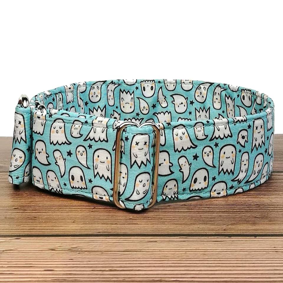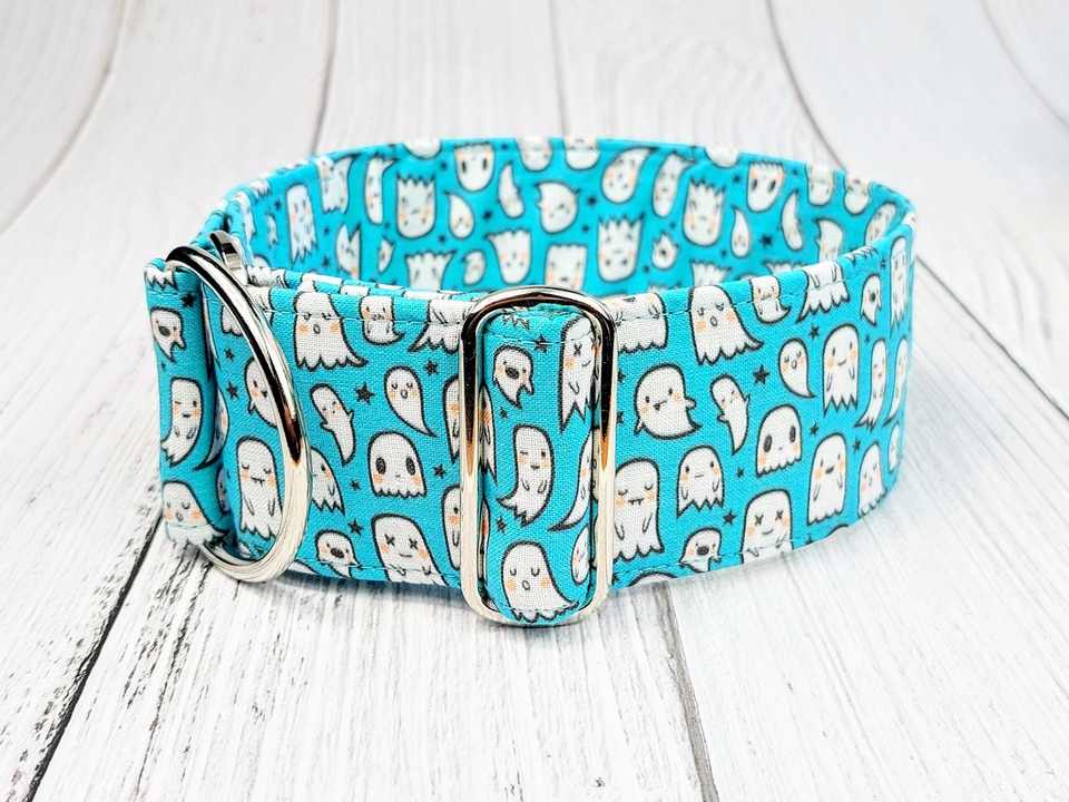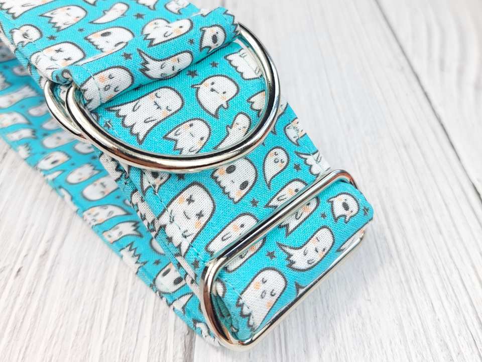 Collar de martingala o hebilla de deslizamiento limitado de tela espeluznante perro Niño de Halloween, collar de sabueso/"Booo" cian