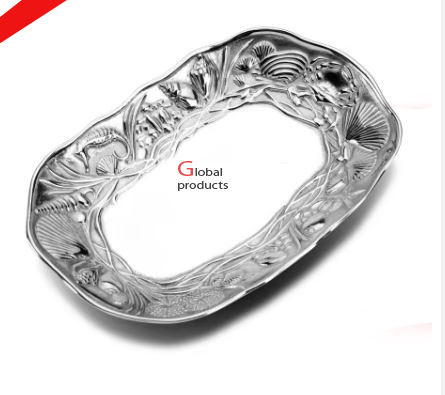 Plato de servicio de metal de diseño grabado con acabado de plata de alta calidad para restaurante y bar de hotel