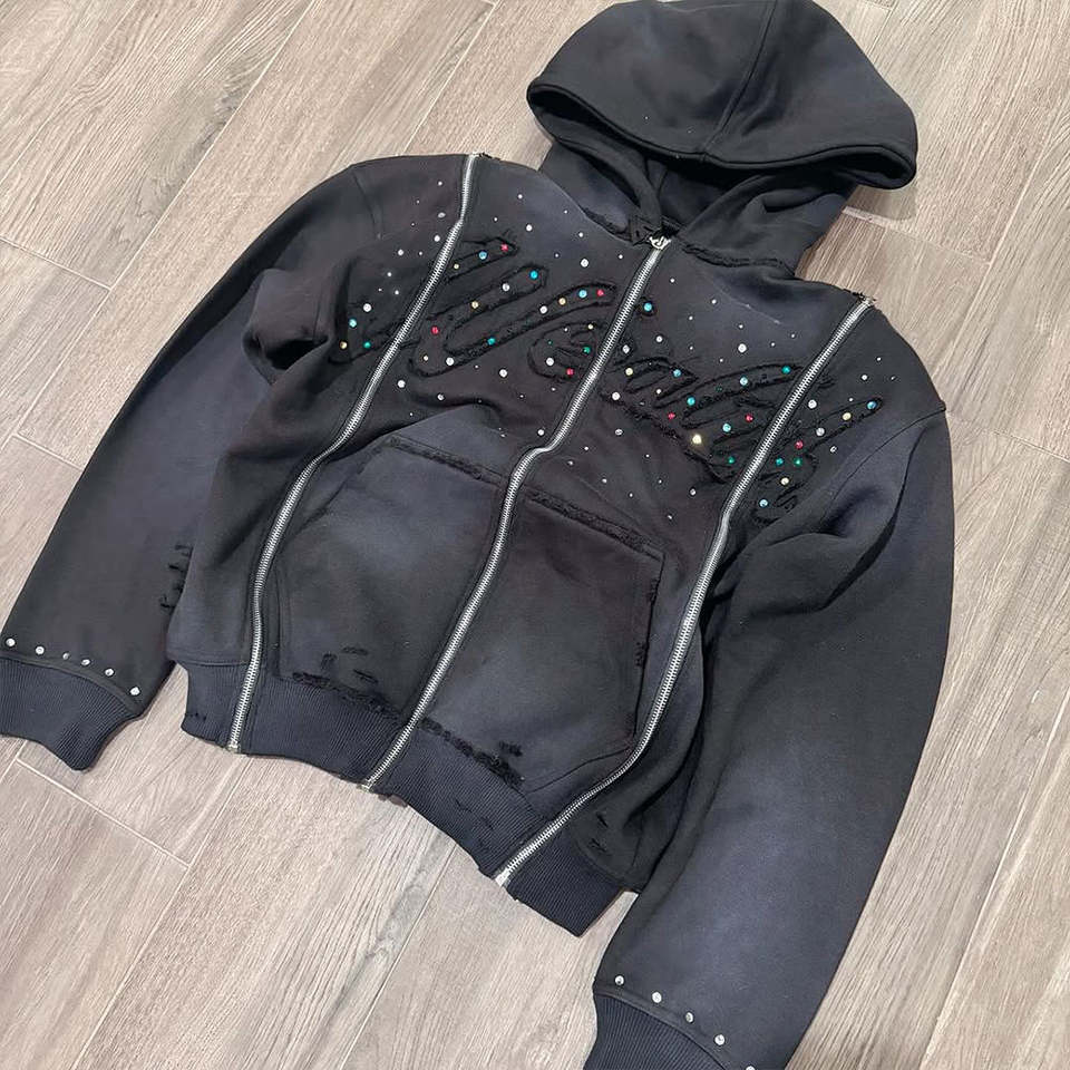 Sudaderas con capucha personalizadas bordadas personalizadas Hombres Rhinestone Sudadera con capucha Doble cremallera con capucha de peso pesado de alta calidad Servicio OEM