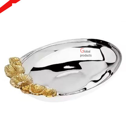 Plato de servicio con acabado plateado de metal de forma redonda con mango dorado para restaurante y bar de hotel