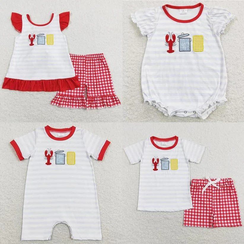 En stock: Conjuntos de ropa infantil de boutique con patrón de camarones y maíz bordados, ropa para niñas, ropa infantil al por mayor