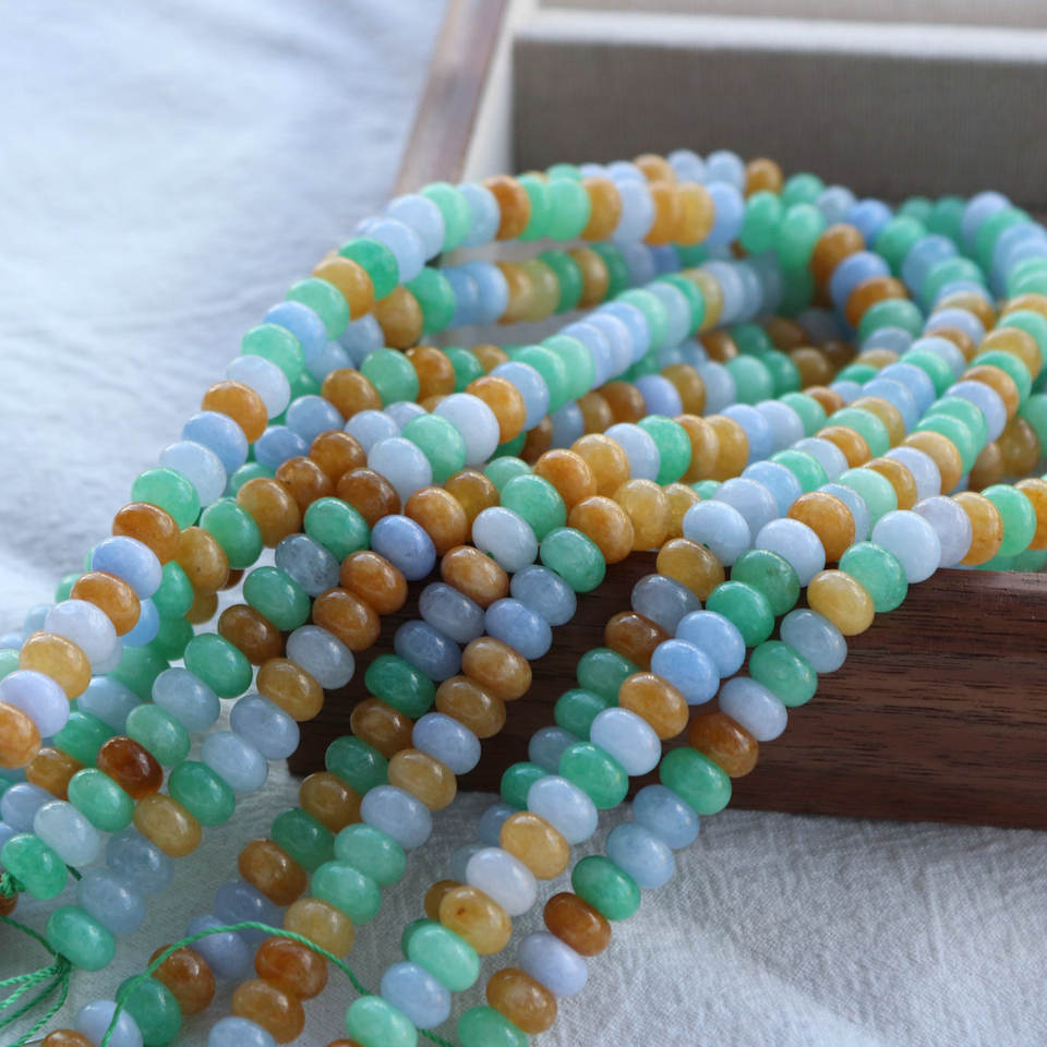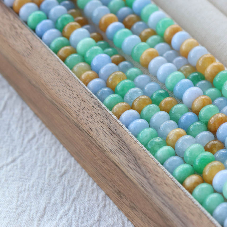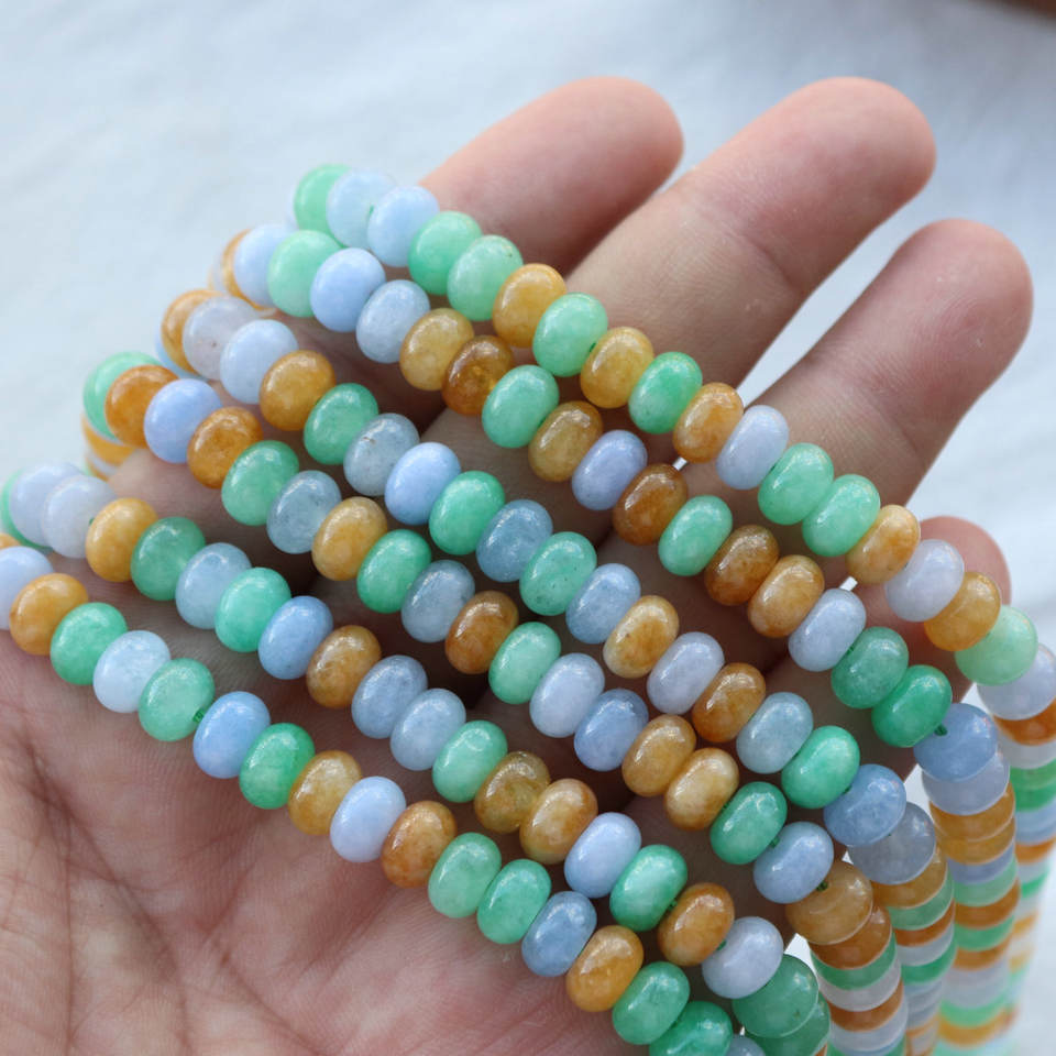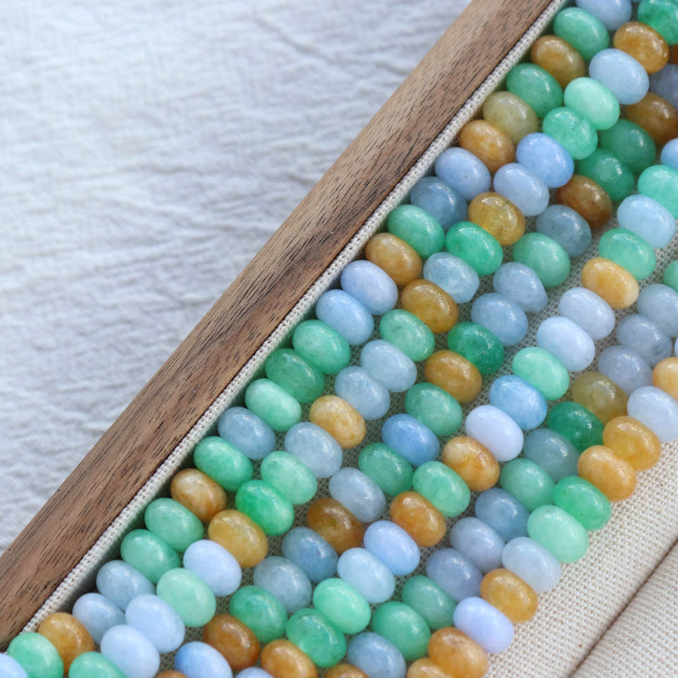 Jade de primavera coloreado Jiny, cuentas de ábaco de jade blanco, birmano, optimizado en colores amarillo y azul.