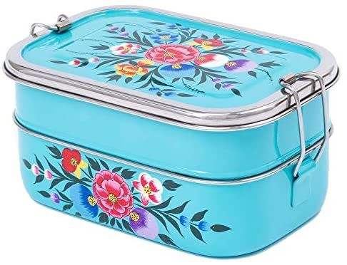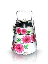 King Internacional-tiffin indio redondo de acero inoxidable, soporte para comida con mango, 3 niveles de capacidad, estampado a color