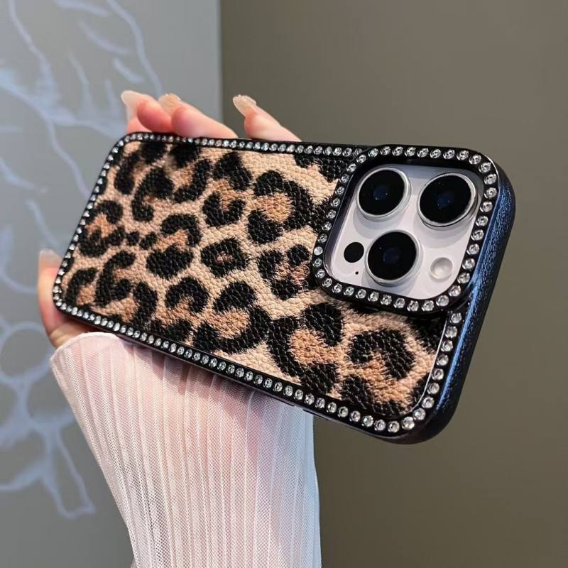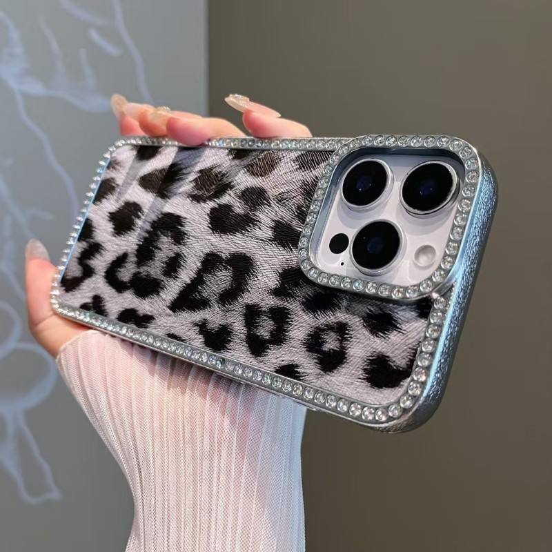 Funda de Lujo para Teléfono Móvil con Diseño de Leopardo y Diamantes Brillantes para iPhone 17 Air 16 15 Pro Max, Cubierta Trasera de Cuero PU Suave con Electrochapado