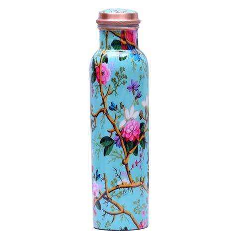 Botellas de cobre con adhesivos multicolor