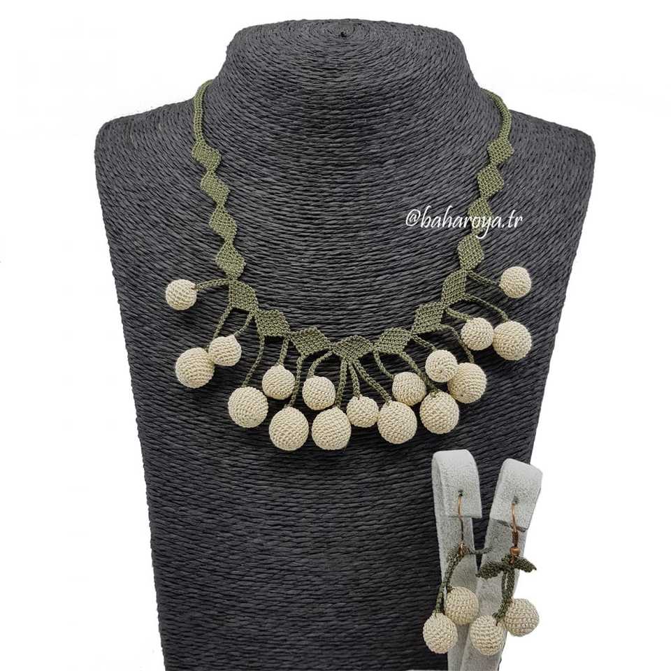 İğne Oyası Sıralı Toplar Kolye-Moda Dünyası İzadi Küpe Set Krem