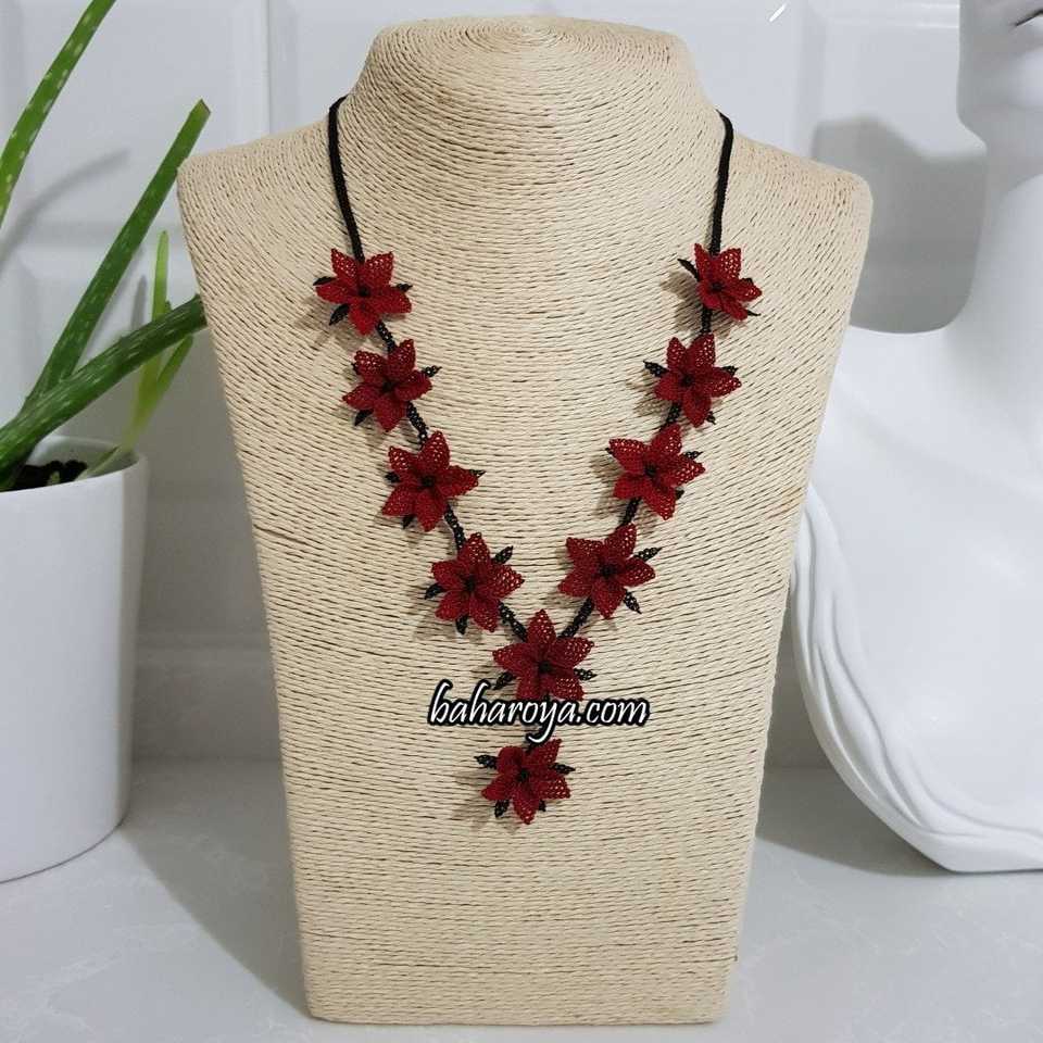 İğne Oyası Sıralı Çiçekler Kolye Kırmızı-Siyah Moda Halsız Unik Tasarım