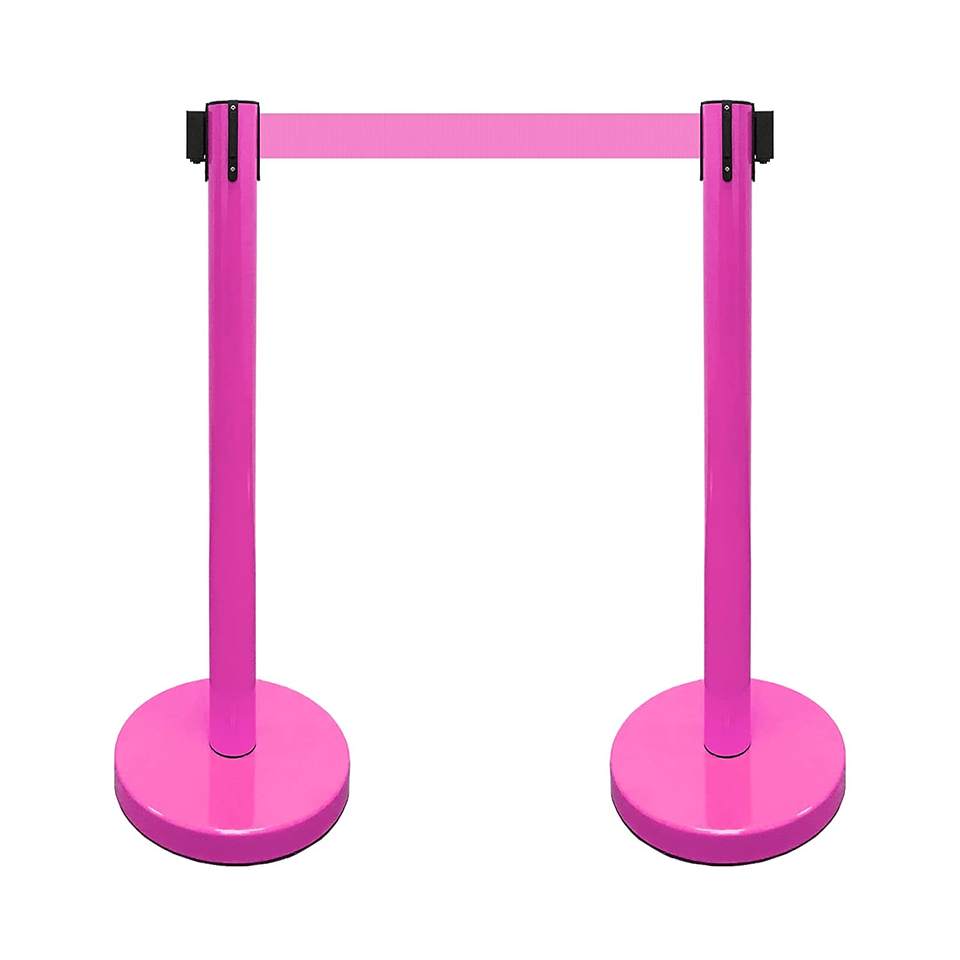 Poste separador rosa con cinta retráctil para museo