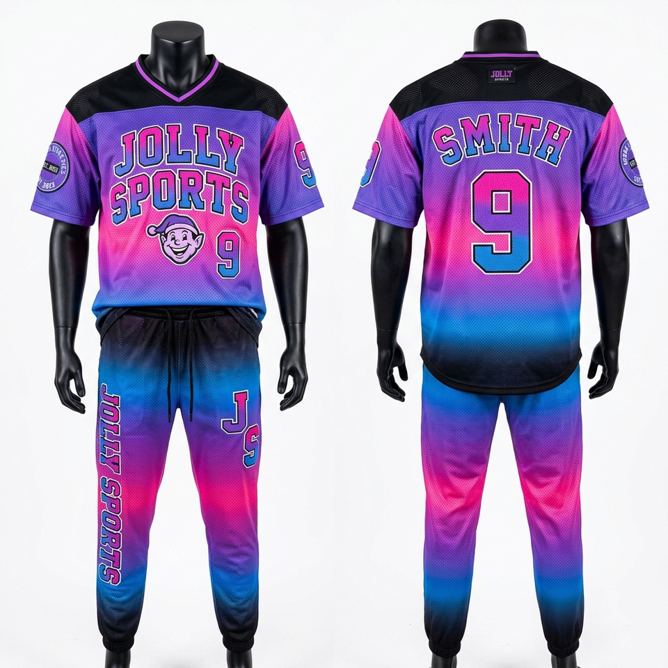 Conjunto de pantalón y camiseta de malla de poliéster en degradado morado, rosa y azul con panel negro en el hombro, sublimación, logotipo personalizado, conjunto corto para hombre