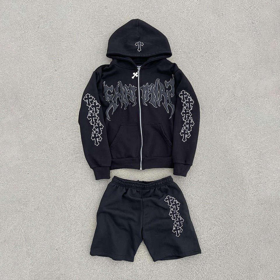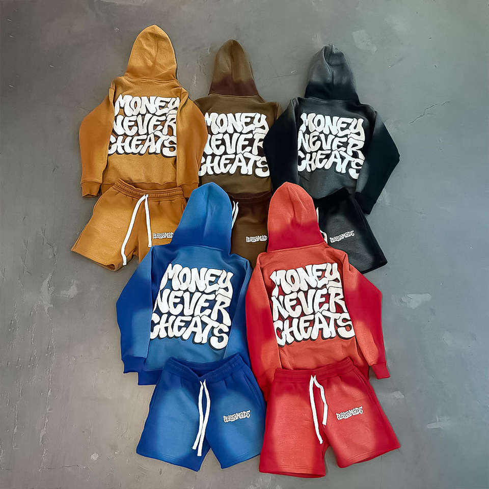 Ropa de calle con lavado ácido unisex, chándal con serigrafía, Sudadera con capucha vintage y pantalones cortos recortados, moda urbana para hombres