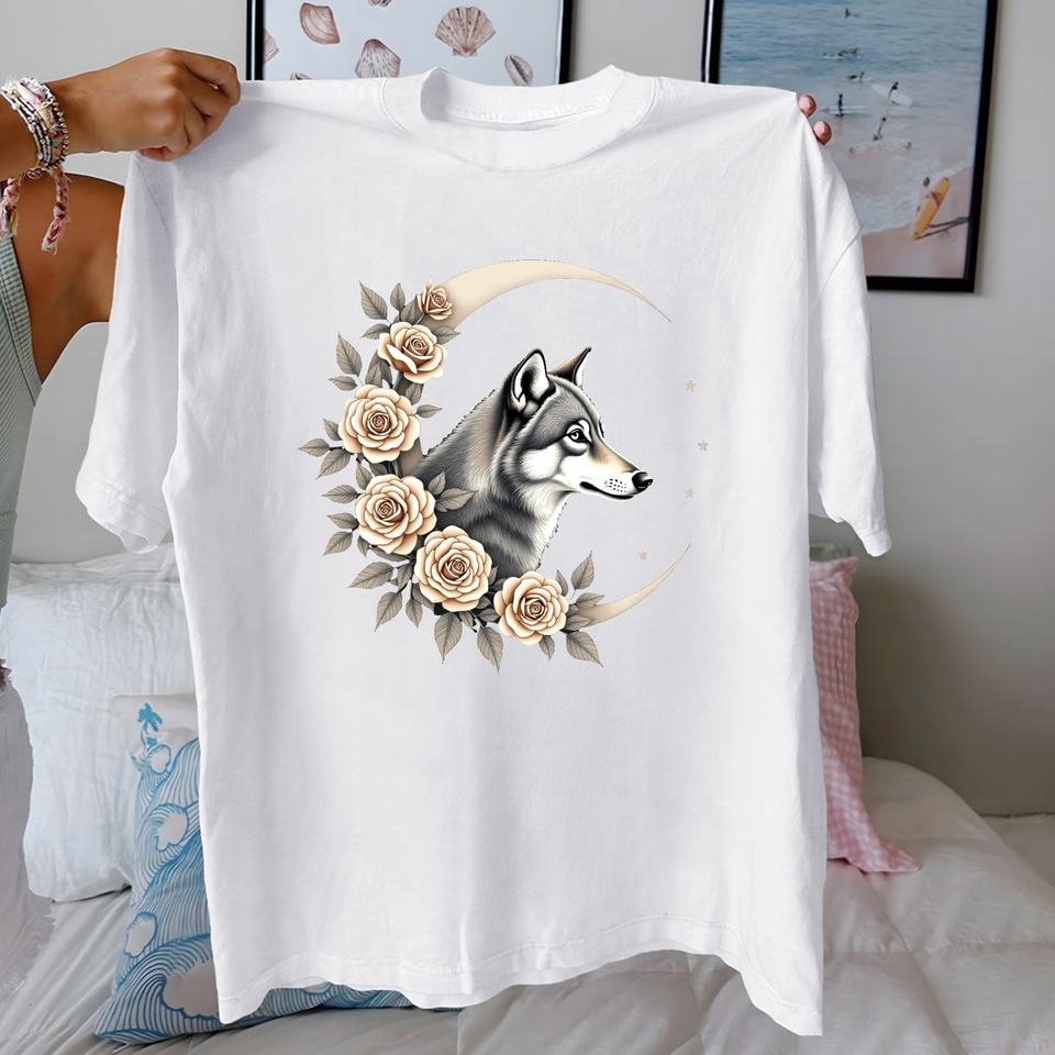 Cabeza de Lobo con luna creciente Camiseta de algodón puro Mujer ajuste cómodo