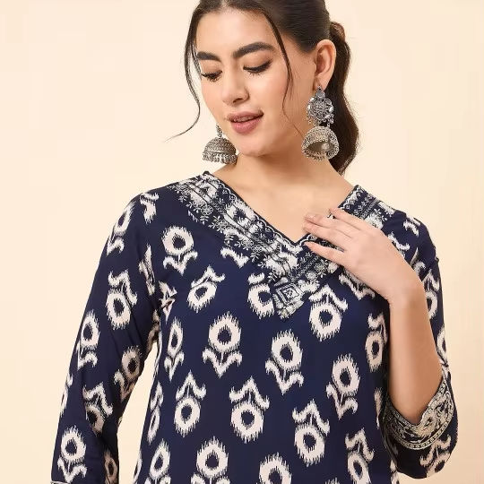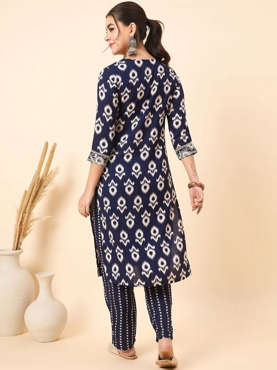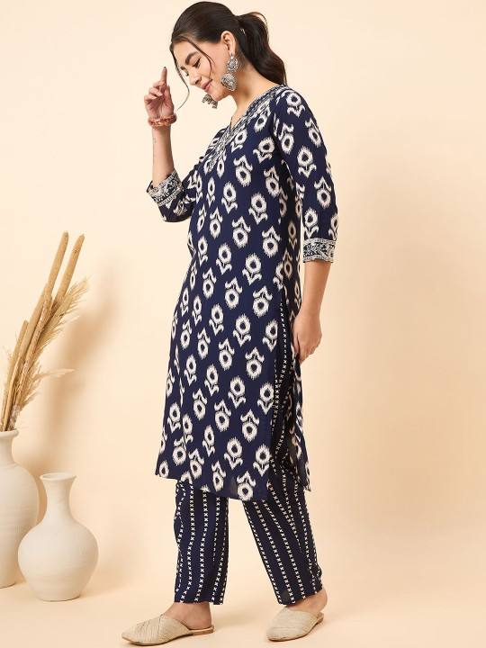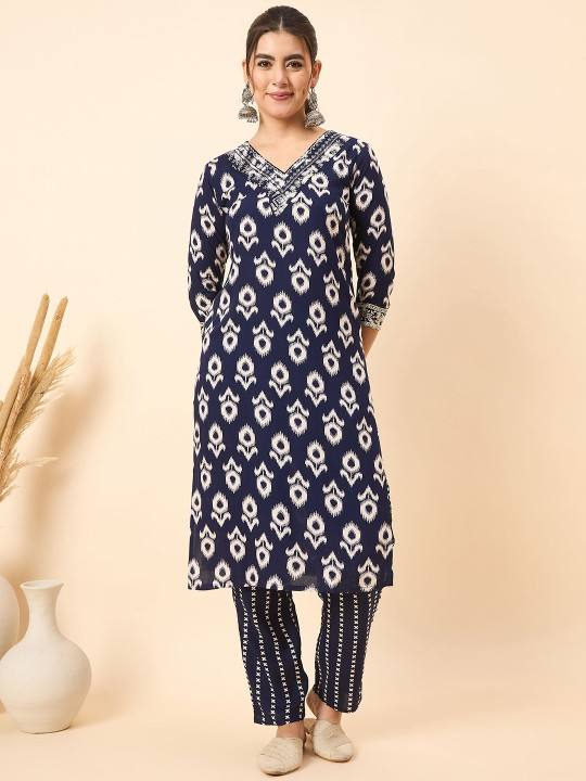 Mujeres azul estampado geométrico puro algodón cuello en V recto Kurta con pantalón indio pakistaní salwaar kameez traje