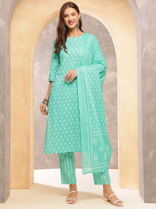 Mujeres motivos étnicos impreso regular puro algodón Kurta con pantalones y Dupatta indio traje pakistaní