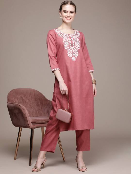 Mujeres Floral Yoke Design Regular puro algodón Kurta con pantalones indio Pakistán Salwar kameez
